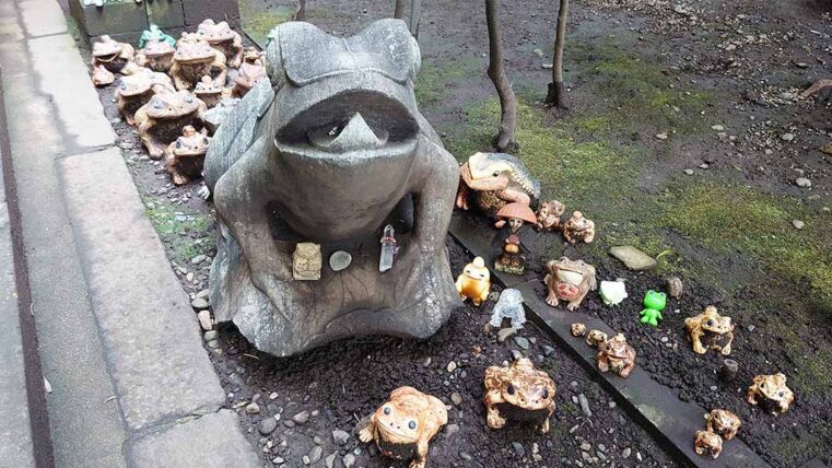 ちなみに、日本の神社などでは縁起の良いカエルの置物がよく観られるが、この将門塚では無数のカエルのオブジェクトや小さな水晶が設置されている。