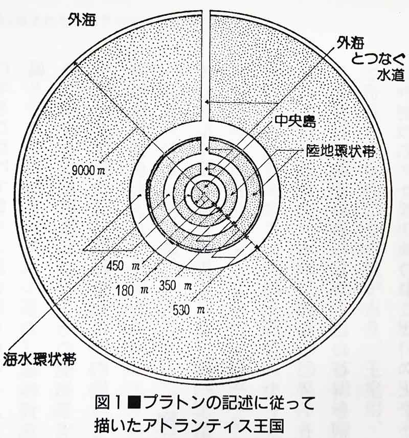 ちなみに、アトランティス大陸はヨーロッパやリビア(アフリカ)、アジアよりも巨大な島だったと語られており、島内の王国周辺は環状体のような幾何学的造りとなっていた。